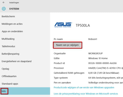 Naam van pc wijzigen. Door op dit veld te klikken, kun je zelf een nieuwe naam voor je computer bepalen: