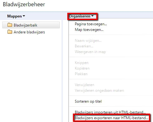 Bladwijzerbeheer. Om je bladwijzers te exporteren klik je in het volgende overzicht op de titel