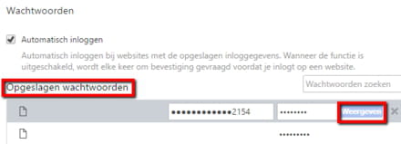 Opgeslagen wachtwoorden tref je alle in het geheugen van je browser aanwezige passwords en gebruikersnamen aan. Om de gegevens weer te geven, klik je op de bijbehorende website en vervolgens op